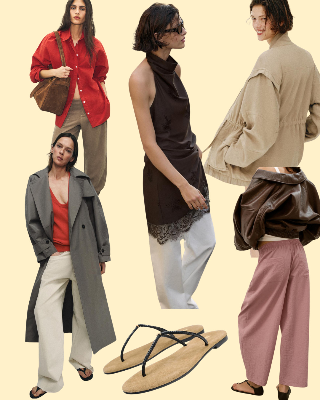 Red shirt, Grey Trench (sign up for this guy), Sandals, Silk halter, Safari jacket, Pink trousers.