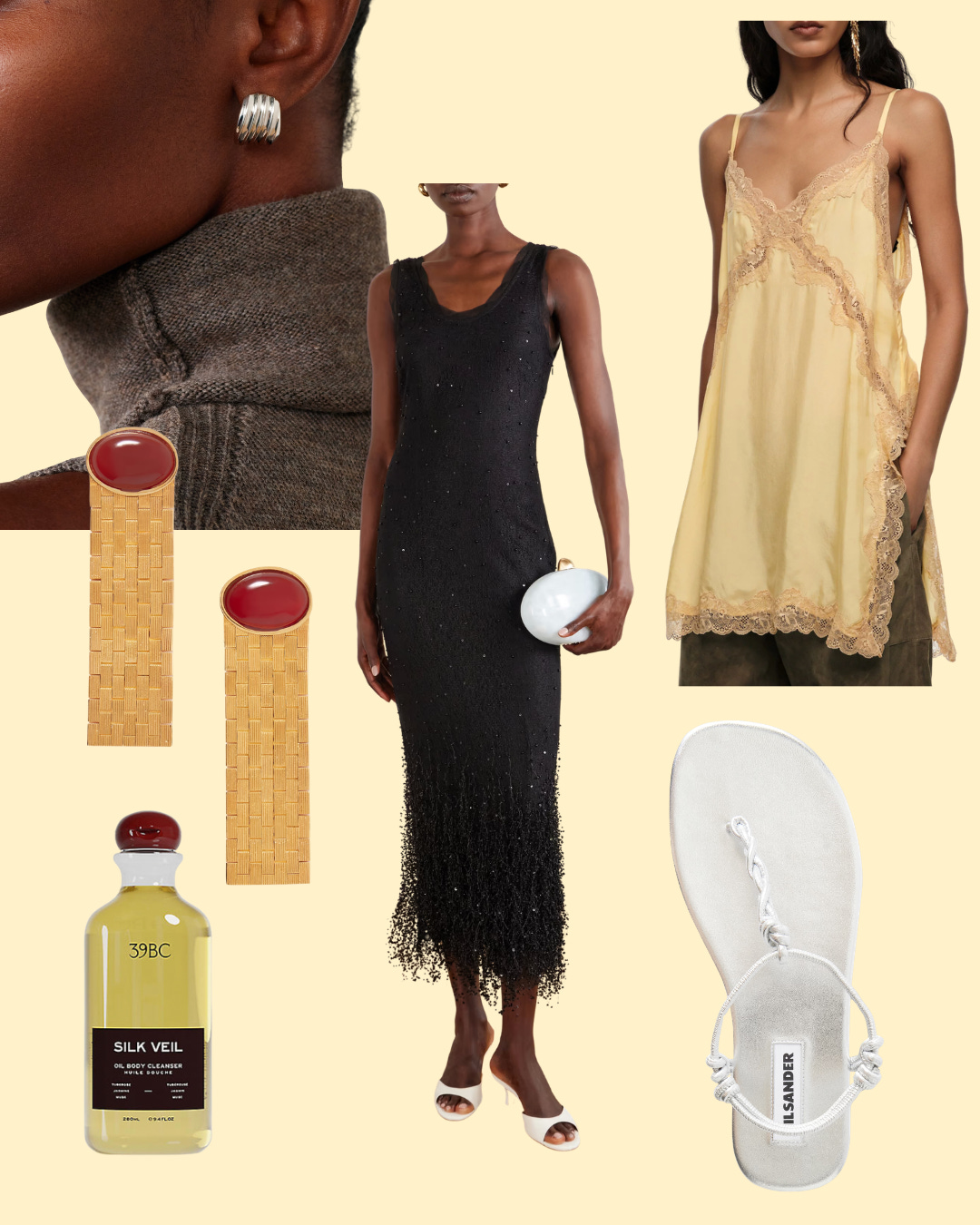 Silver huggies, Gold-plated agate earrings, Body cleanser, Beaded dress, Silk slip, Sandals.